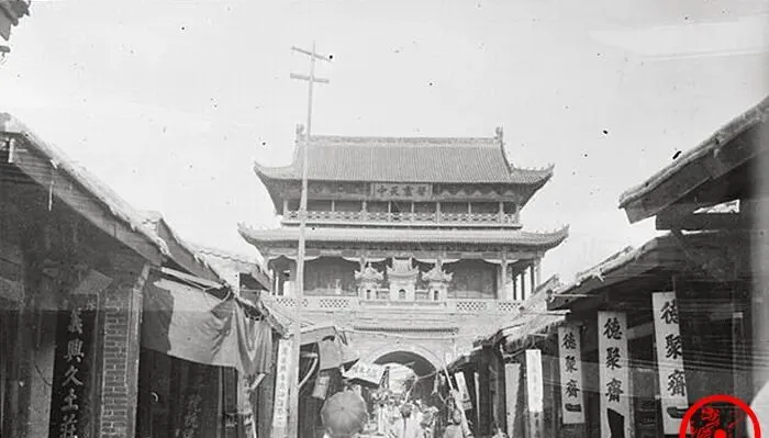 图中这座高挑三重檐的楼叫鼓楼,檐角飞起,木梁上能看见密密的斗拱,正楼下拱券门洞像咽喉一样连着南北街市,左右挂着布招牌,写着德聚斋、义兴久这样的字号,听口气就知道是鞋铺和土庄,热闹是有点热闹,可你瞧地上坑洼的土道,一脚下去就能溅一裤腿的泥点子。