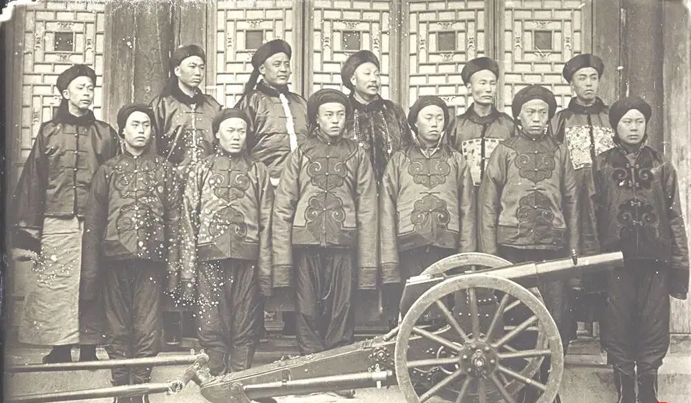这个大阵仗叫队列照,前面一门木轮小炮当道具摆着,炮身短粗,铁箍一圈一圈缠着,后排几位戴补服的官员看着体面,胳膊袖摆都是暗纹团龙,门楼的格扇窗细密得很,雕花里夹着岁月的霉斑,奶奶看见这张就说,过去当兵讲究衣冠整肃,可真上阵时,枪法不行就白搭了。