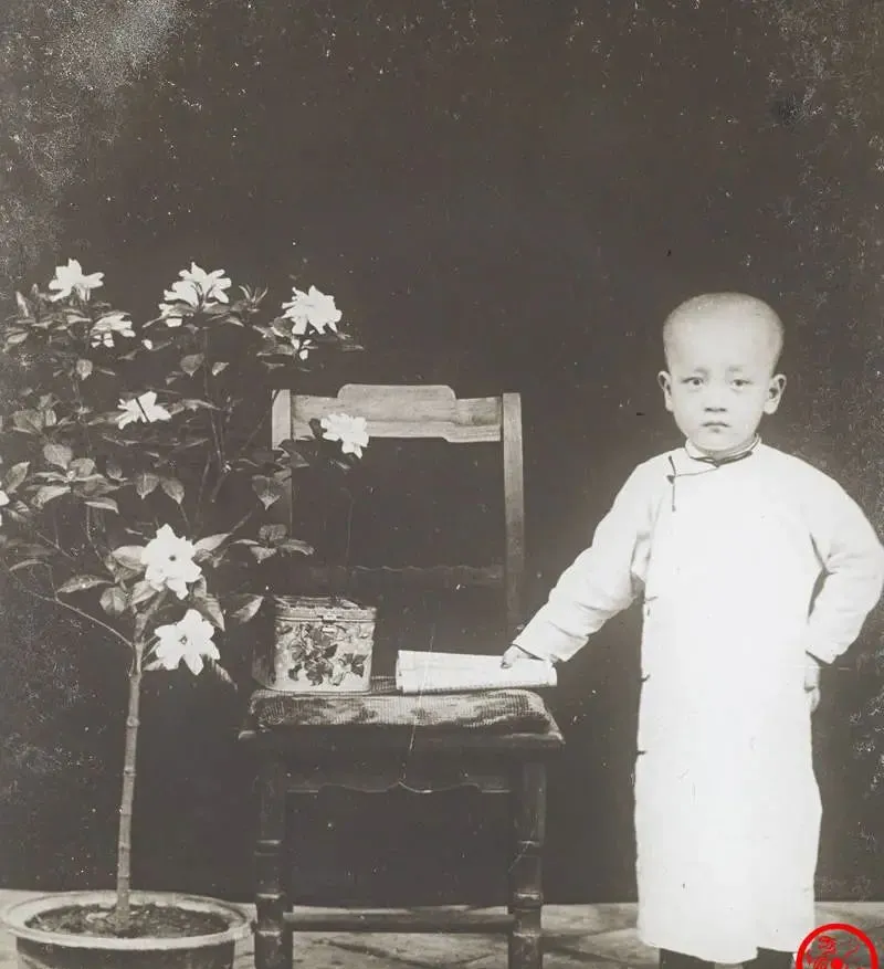 这个场景叫照相馆棚拍,小椅子上垫着软枕,旁边立一盆栀子,花开得白亮,小男孩一手叉腰一手按着书册,长衫阔袖,圆头布鞋,脸上那股拧劲像是在说我才不困呢,外婆笑他是**“小读书种”**,以前拍一张相片不容易,得穿好衣裳、抹点香油、站稳了,咔嚓一下定格多年,哪像现在手机一摁,十连拍不带喘气。