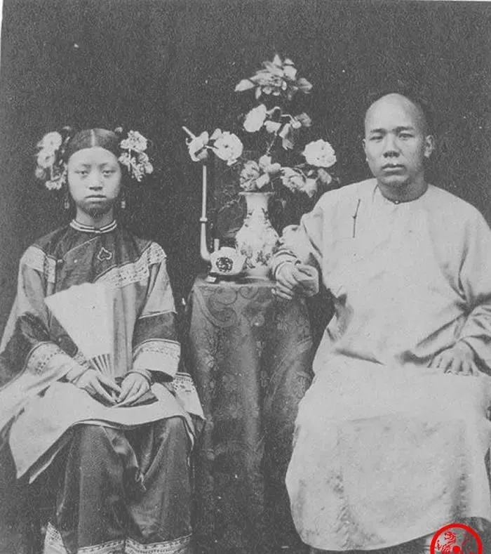 这个场景叫影棚,桌上瓷瓶插花,烛台摆造型,男的穿长衫握着桌沿,女的绸缎大袖,发上别着大朵绢花,规矩是一人执书一人执扇,显个斯文体面,可神情还不习惯对镜头,女的眉心拧着弯钩似的褶子,像是怕动一下就拍糊了,师傅从幕布后探头说,别眨眼,来,定住。