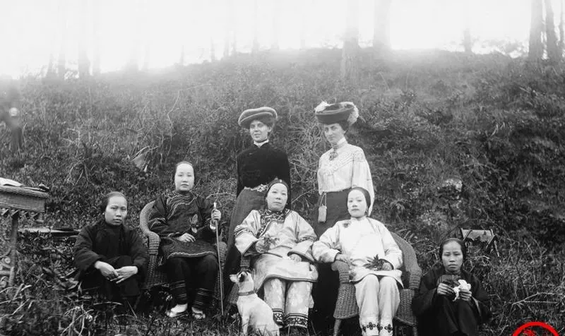 这张里最扎眼的是靠背藤椅和大檐帽,坐着的三位衣料讲究,袖口滚边,鞋面钉花,手上带着小指套的翠,身后站着两位洋人妇女,帽檐压得低低的,面上带笑不出声,旁边的小几上堆着茶盏和点心,姿势摆得端端正正的,像在告诉你有钱真能把世界请到院子里来。