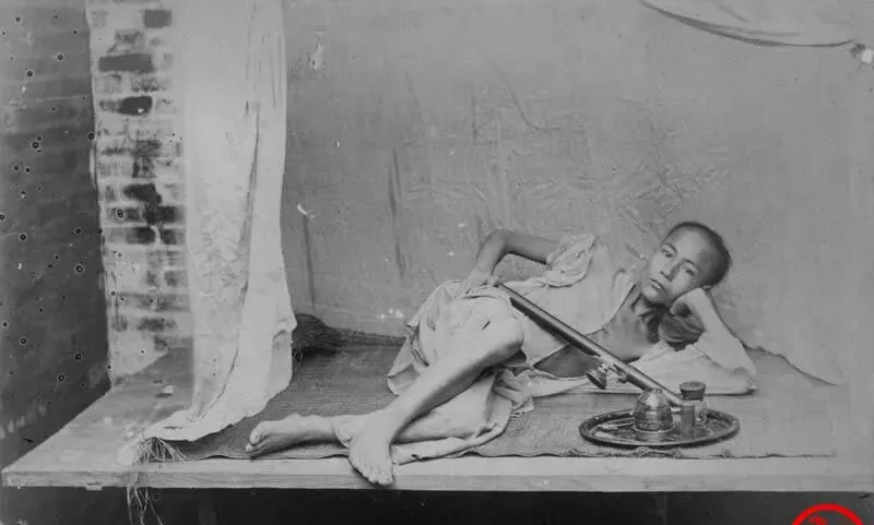图中那把长杆叫烟枪,前头接烟锅,旁边一盏短肚的油灯是烟灯,托盘里放着烟膏和小勺,人侧躺在凉席上,半支胳膊枕着脑门,眼皮下坠,像被抽了筋骨的力气,屋角的布帘子皱巴巴贴墙,连风都懒得进来,奶奶说,沾上这玩意儿呀,家里啥都空了,连锅都得当。