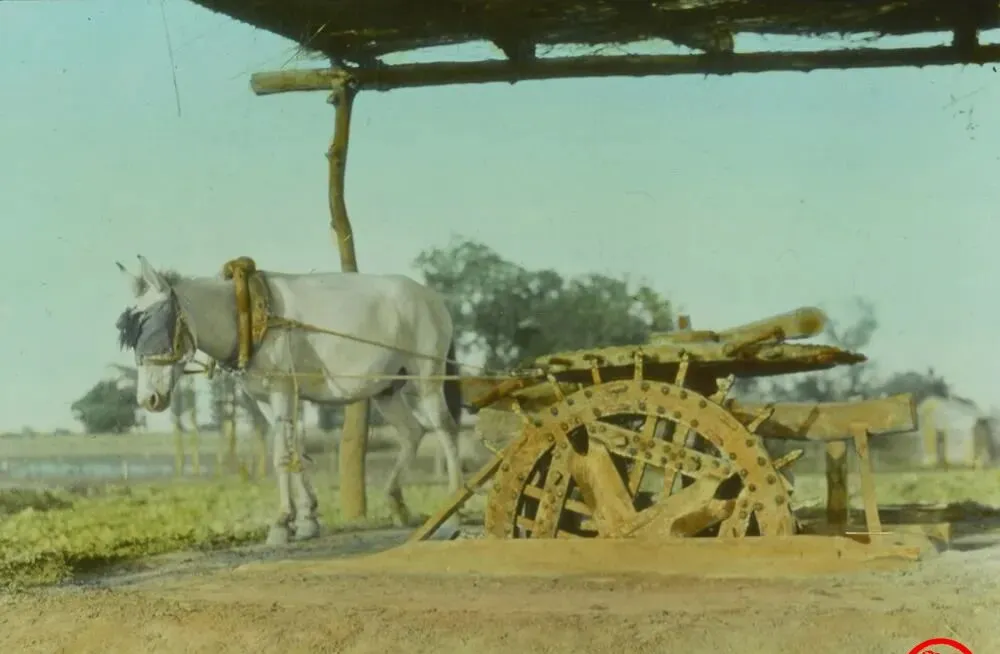 这个木胎铁钉的玩意儿叫翻车,也有人叫水车,靠着牲口绕圈拖动,大木轮扎进沟里,卡嗒卡嗒把水往高处翻,夏天晒得头皮冒烟,牛驴眼上罩着帘,防惊也防阳,爷爷说转得久了,人得接水抄杓,手臂酸得直抖,可停不得,秧田等着喝水呢,现在一开电机哗啦啦满沟清亮,那时候一圈圈换来的,全是汗。