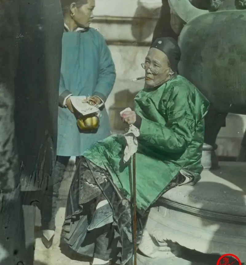 这个身上绿缎袄的叫老娘娘可不敢乱叫,她叼着长烟,鼻梁上架着细圈老花镜,脚下是绣花鞋尖,脚背绷得紧,裹小脚的人走起路小心翼翼,旁边的小丫头捧着个金色的盒子,眼神在旁边游,奶奶说过去讲究排场,衣裳抹得亮,心里却怕事,时代一翻篇,许多讲究也就没了。
