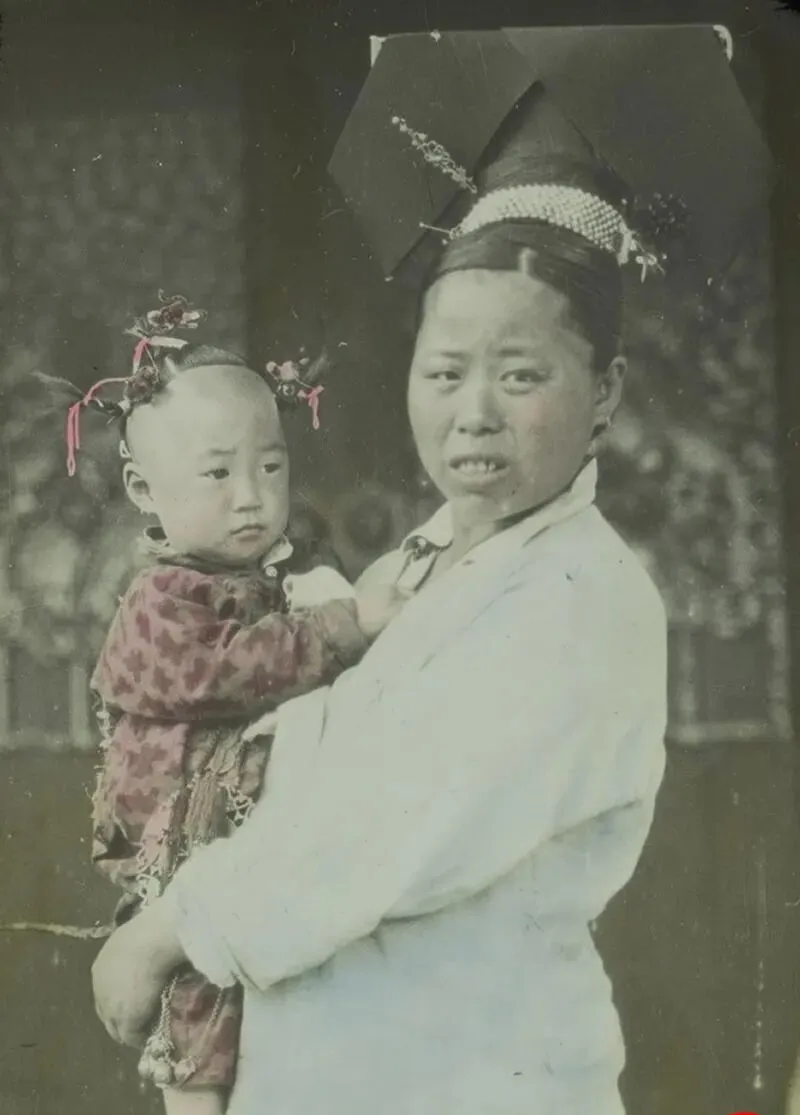 这个大翅一戴就知道是满族的大拉翅,黑亮的硬翅板斜斜挑着,发髻盘得紧,额前珠串一溜儿,怀里小孩梳着双丫髻,红绳子挂坠晃悠,镜头一来,娘紧张,娃发怔,我小时候看戏台上的格格,也这么打扮,外婆在旁边嘀咕,装是好看,过可不轻松,那时候身份像衣裳,华丽也沉。