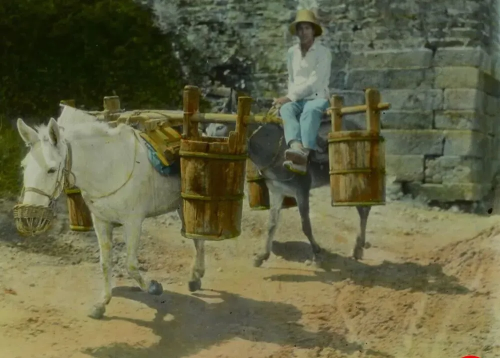 这个木桶成对挂着,叫驮水桶,厚板用竹钉咬合,拎环是麻绳缠的,驴背上再加一付扁担,走砂石路最怕打滑,桶里水一荡,腰就一紧,男人戴草帽,脚跟拢着马肚,两边水声咚咚响,村里没井的人家就靠这一路水,渴了也舍不得就地舀口喝,现在自来水一拧就来,敢信吗。