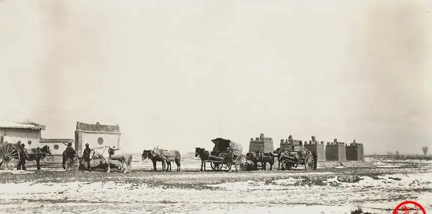 图中这一长串车队叫行旅队,多是骡马套着大木轮车,车篷用粗布蒙着,轴头抹得黑亮,雪地里轧出两道深辙,车夫缩着脖子吆喝一嗓子,骡子耳朵一动就跟上了,老辈人常说出关进关都要在这片地带歇一脚,喝口热茶才有劲儿扛风沙。