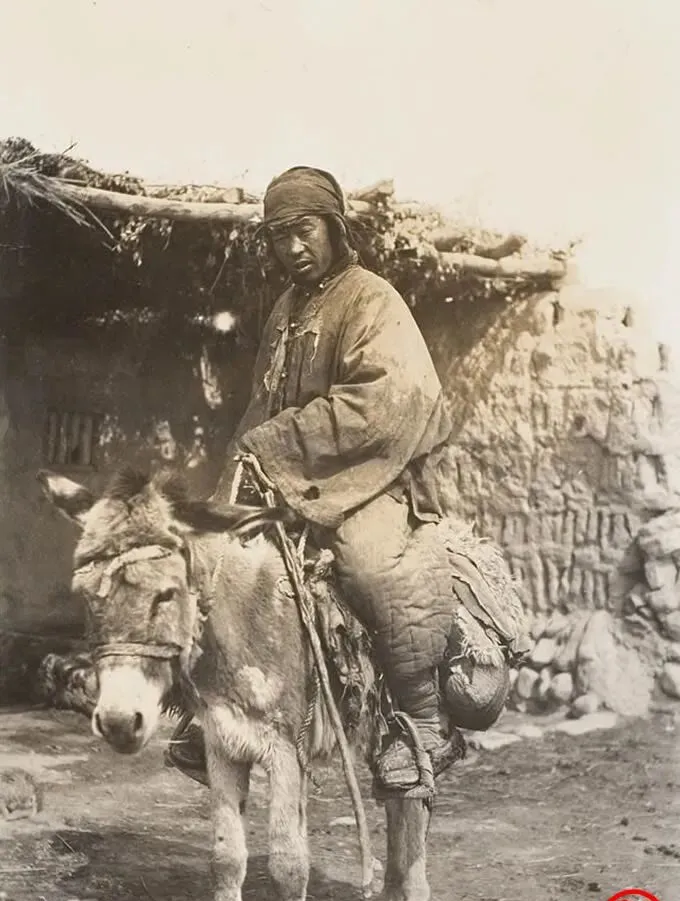 这个趴在毛驴背上的叫脚户,也有人喊赶脚的,破棉袄鼓着风,袖口补了又补,缰绳用草绳打个活结,驴耳朵上还缠着布条防冻,奶奶看了照片直摇头,说那时人穷得紧,驴是腿,草绳是命,天亮了走天黑了栖,能混口热汤就算过关。