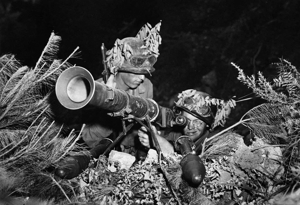 在釜山环形防御圈前线,两名美国士兵在使用“超级巴祖卡”火箭筒。