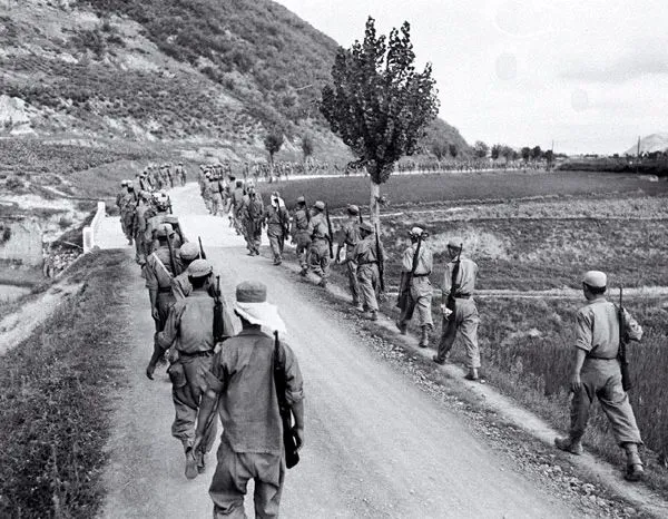 1950年8月浦项战役,正在向釜山防御圈增援的韩军。此战为朝鲜战争转折点,此后朝鲜人民军补给线被切断,一路败退至鸭绿江。