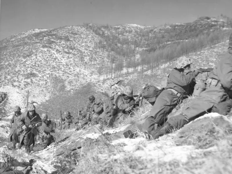 长津湖战役中,美国陆战队员在与中国志愿军交战。