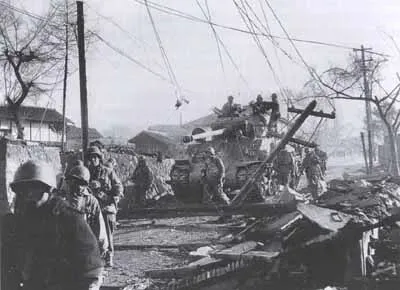 1950年9月美军夺回韩国首都汉城,在朝鲜人民军的抵抗下,美国海军陆战队进行了艰难的巷战。上图可以看到手持步枪的美军、街头的朝鲜人民军尸体、远处的谢尔曼坦克。