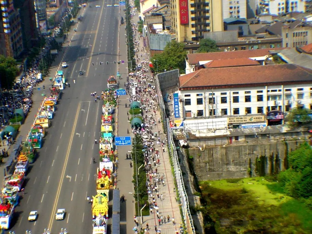 新闻老照片|2002年9月,长沙湘江大道,全省14个市州的彩车整装待发