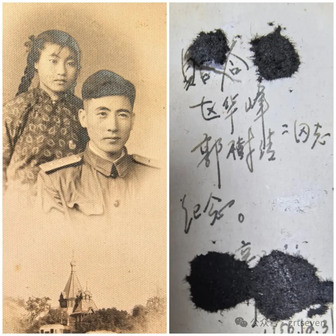 这张是辛彦福叔叔与爱人的合影。后面有题字,可惜也有污损,字迹不全。但我爸妈的名字很清楚,是赠给我爸妈作纪念的。