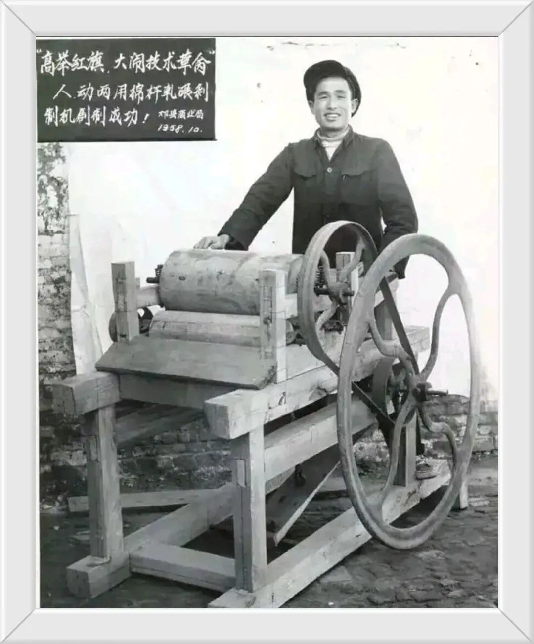 1958年,棉杆轧碾机技术革新,研制成功脸上的笑容掩不住。