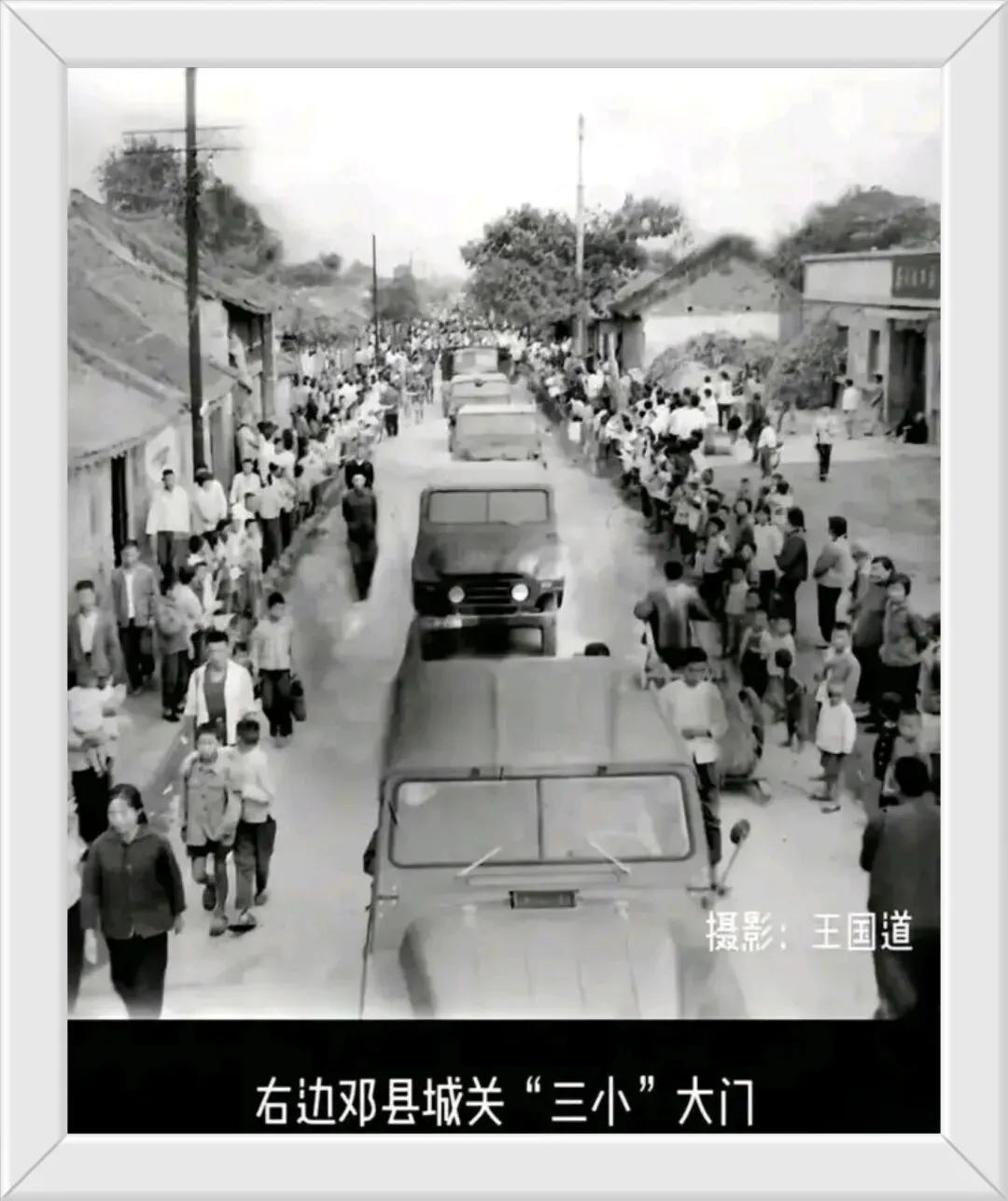 邓县城关“第三小学”的大门口,右手边是校门,汽车一辆接一辆的,路两边占满了人,这是在干什么?是不是领导视察?