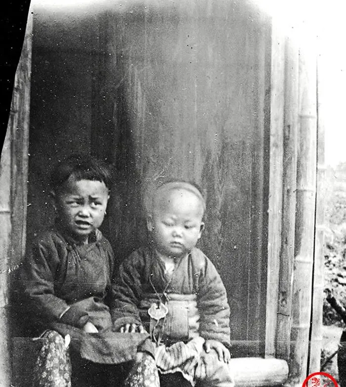 这俩小孩,一个眯着眼逗脸,一个圆头圆脑挂着长命锁,这个场景叫门台打盹,旧木门板冒着灰,风一来嘎吱响,我小时候也这么坐,裤腿一抖能抖出半把土来,奶奶端碗稀饭出来就吆喝,别晃,洒了又哭,那会儿玩意儿少,乐子都在门口。