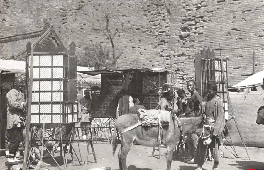 这摊儿叫拉洋片,木匣子一人多高,面上钉着花格子,侧边拴根杆子,里头是连着讲的画片,抬头看的是故事,低头算的是生计,驴子背着家什,估摸着刚从一处赶到一处,孩子凑在洞口上眼一贴,师傅就拍着箱沿吆喝,好戏开咯,以前的影院是四条腿驮着走。