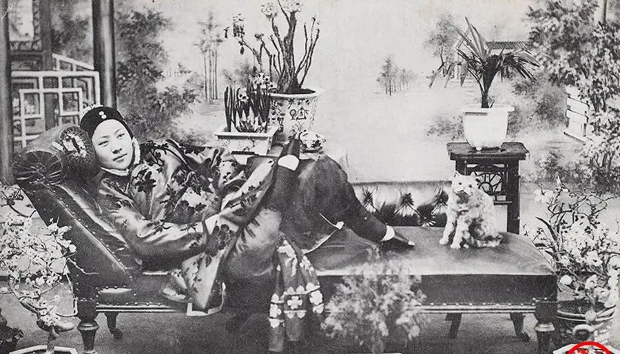 图里这位叫照相馆仕女留影,锦缎团花滚在身上,头靠软枕,脚尖翘着露出小鞋头,旁边放满盆景,桌上摆多肉和兰草,姿势讲究,神情却轻松,像在说你看我这身行头,照相馆的背景画得热闹,桥亭山石一应俱全,那时候拍照是件大事,现在是随手一按。