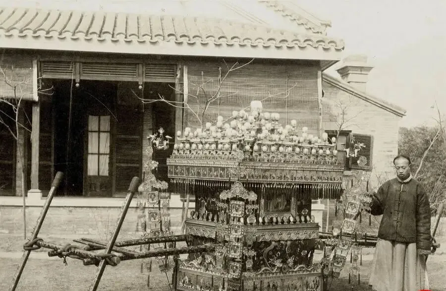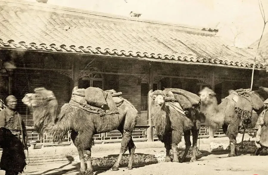 晚清老照片:大户人家打造精美花轿,街道上骆驼结队行走。