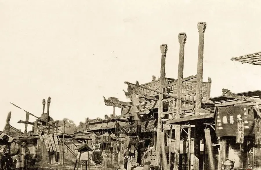 这个高得扎眼的木杆叫冲天柱,三根一溜子竖在店门口,柱头雕兽吞云,横梁挑出小牌匾,意头就是财气冲天,掌柜的常吩咐伙计擦柱身的灰,别叫晦气落着,现如今商铺玩灯箱和霓虹,讲究的是亮堂和跳色,老木柱可少见了。
