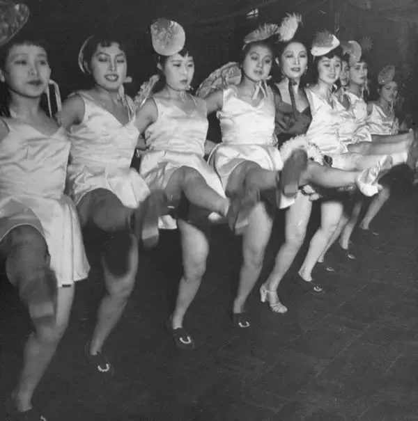 1946年3月,沈阳,日本女舞者在表演空隙休息,台下是一群喝的酩酊大醉的苏联红军军官。