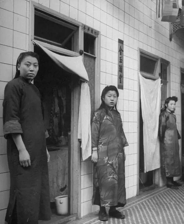 1946年3月,沈阳,妓女们站在妓院自己的房门口招揽客人。