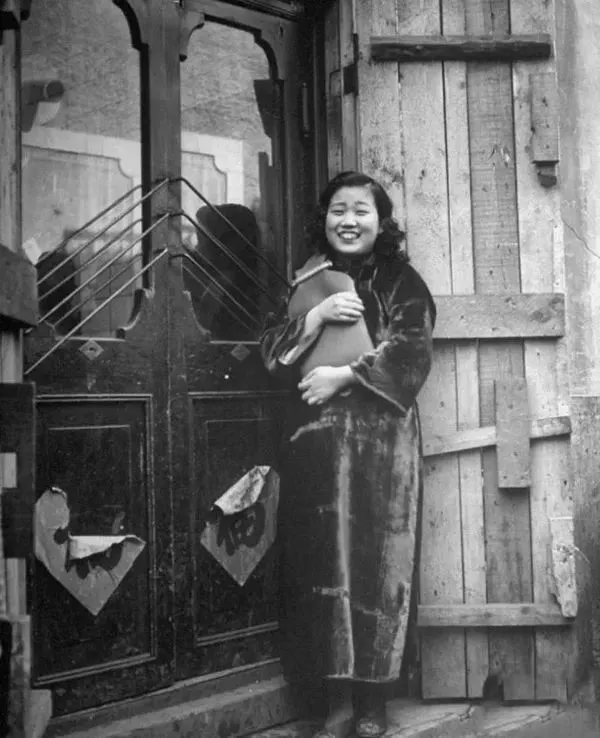 1946年3月,沈阳,一名妓女站在她的公寓门口,手里拿着热水袋以抵御冬天的寒冷。
