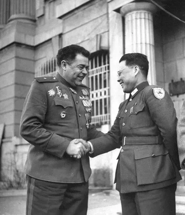 1946年3月,沈阳,根据联合国决议,原日本窃取中国之满洲、台湾、澎湖、南海诸岛等领土均归还中国。这是负责接收的中华民国代表与苏联在沈阳的临时负责人握手。