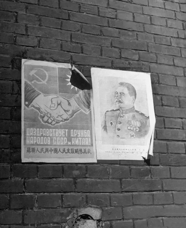 1946年3月,沈阳街道的墙面上到处贴满宣扬苏联和斯大林的海报。