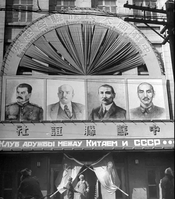 门框上悬挂着斯大林、列宁、孙中山、蒋介石画像,拱形装饰物上用中文和俄文写着“中苏两大民族联合起来”。