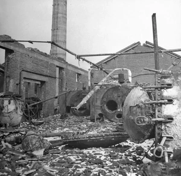 1946年3月,沈阳,原来的一家大型日本人开办的橡胶厂,苏联搬走了所有的机器和设备后把它焚烧掉,但一些搬不走的大型的机器设备清晰可见。