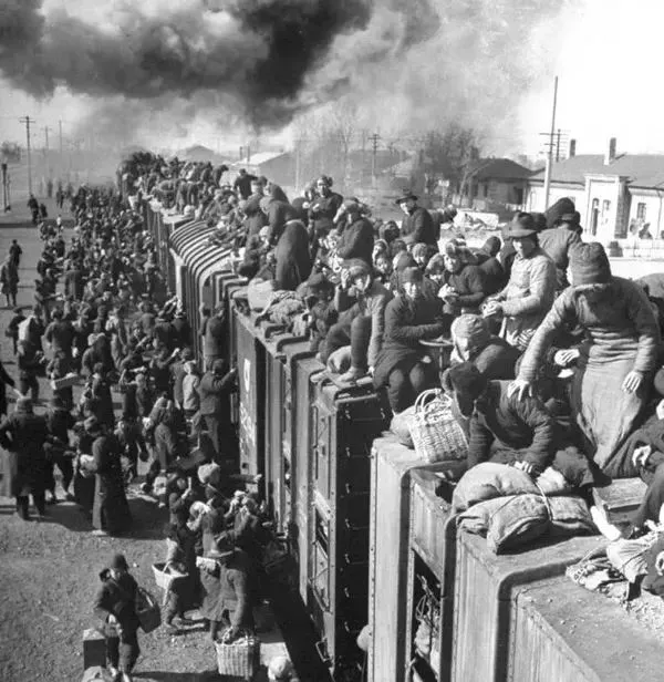 1946年3月,沈阳,旅客们拥挤在火车顶棚。