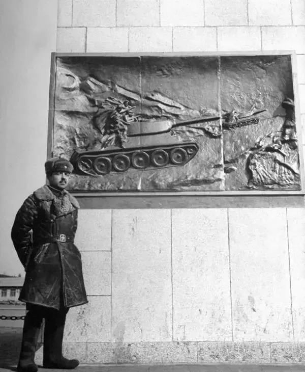 1946年3月,沈阳市中心,苏联人树立了一座高耸入云的纪念塔,塔顶上放置的是苏联坦克,以纪念满洲战役和宣示苏联对满洲国地区的占领。