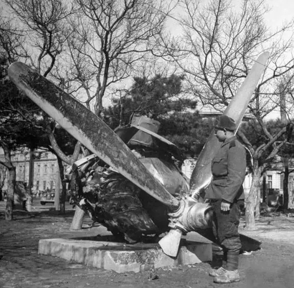1946年3月,沈阳,这是伪满洲国时期的一座公园,日本人将被其击落的美军B-29轰炸机的电机放置在这里以宣扬他们的武功,一个苏联士兵正在参观它。