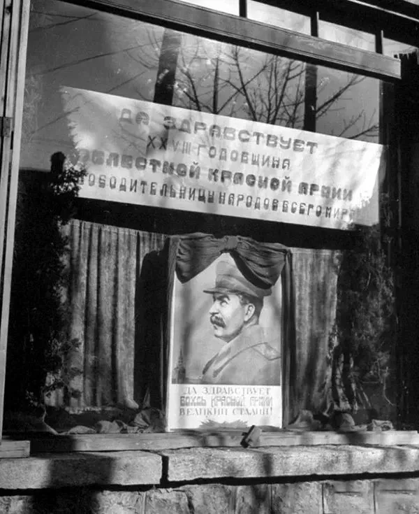 1946年3月,沈阳,在苏联人管辖下获准营业的商铺都必须悬挂斯大林的画像,他俨然成为满洲国地区的主宰。