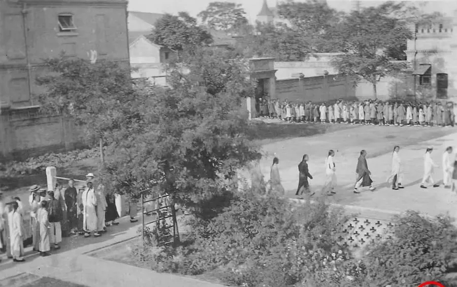 这一长串队伍是去做礼拜,白袍黑袍在树荫下拉出一道曲线,前头几位老师戴草帽,步子不快不慢,钟声一响,大家自然收了笑,奶奶说上学时最怕迟到,门口那块铁牌一敲,全院都听见,比手机提醒顶用多了。