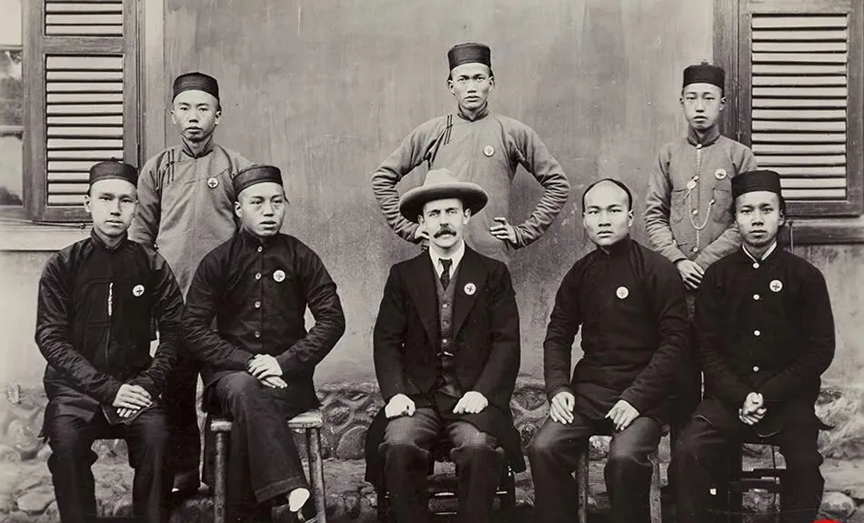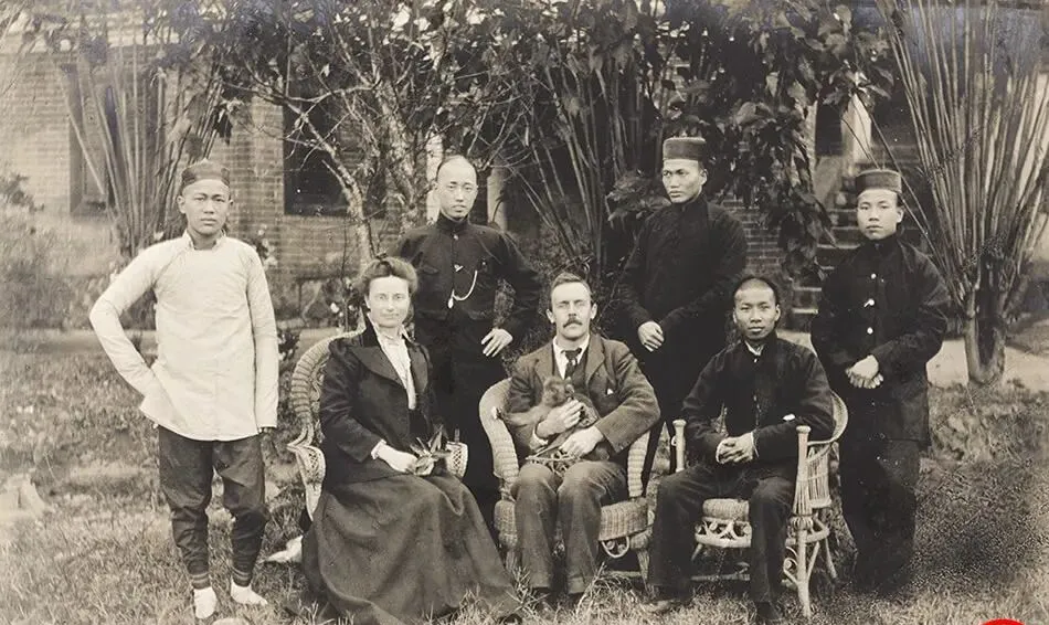 图中这群人叫医院职员与外籍医生合影,前排藤椅一坐一卧,男士留着短须,夫人手里好像还抱着只小动物,周围几位本地小伙穿长衫戴小帽,站姿挺直不怯场,背景是院子里的棕榈和砖楼外墙,风一吹树影斑驳在墙上,像给老照片加了层滤镜。