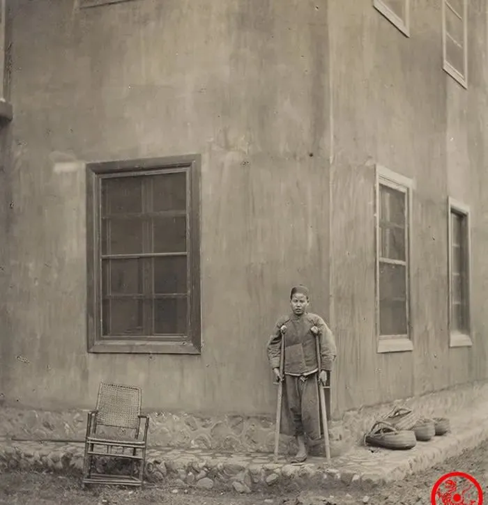 这个角落里的孩子叫门外候诊的病人,两根木拐杖比人还高,腋窝下勒着布带,窗下歪着一把藤椅,旁边躺着两只葫芦样的水罐,墙脚是鹅卵石砌的基脚,粗粝得能蹭破裤腿,那时候看病要走很远的路,拄着拐到院门口已经是一天的力气了。