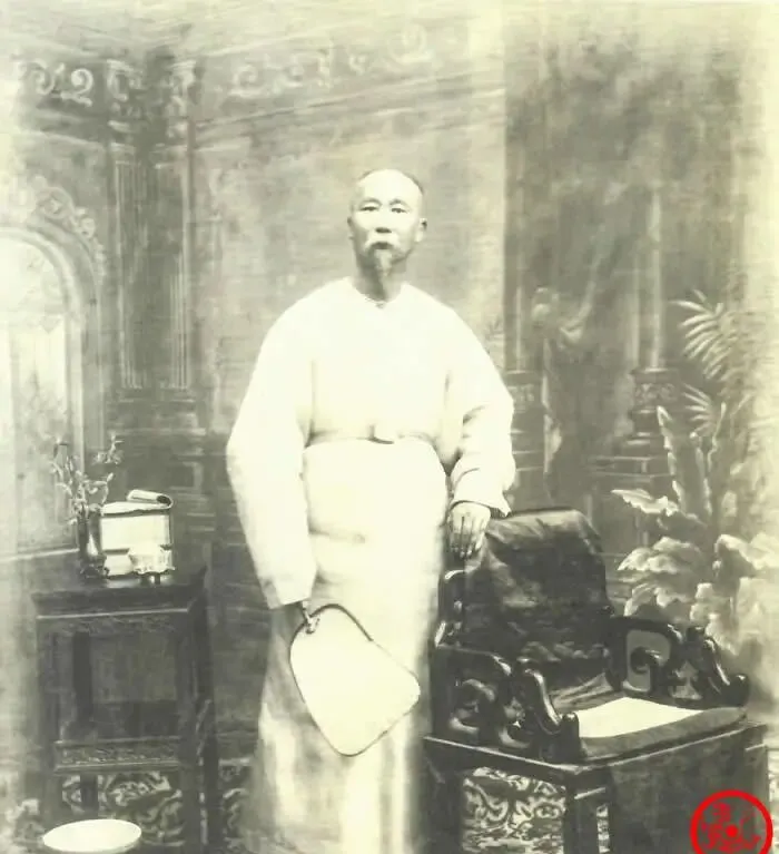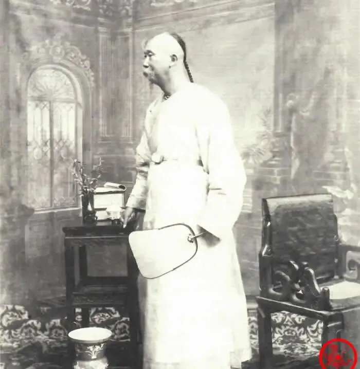 图中这位高个儿就是总督本人,常服素袍束腰,腰间别着扇坠,右手搭在雕花扶手上,面前一张小几,几上搁着书匣与小瓶花,几下是一只圆肚的痰盂,布景是西式拱券和花叶纹,影棚里铺着厚地毯,纹样咕噜咕噜地往外冒,整张照片没有军装与勋章,只有清清爽爽的白,和不急不躁的站姿,像是说今日不谈兵事,只与镜头相熟一次。