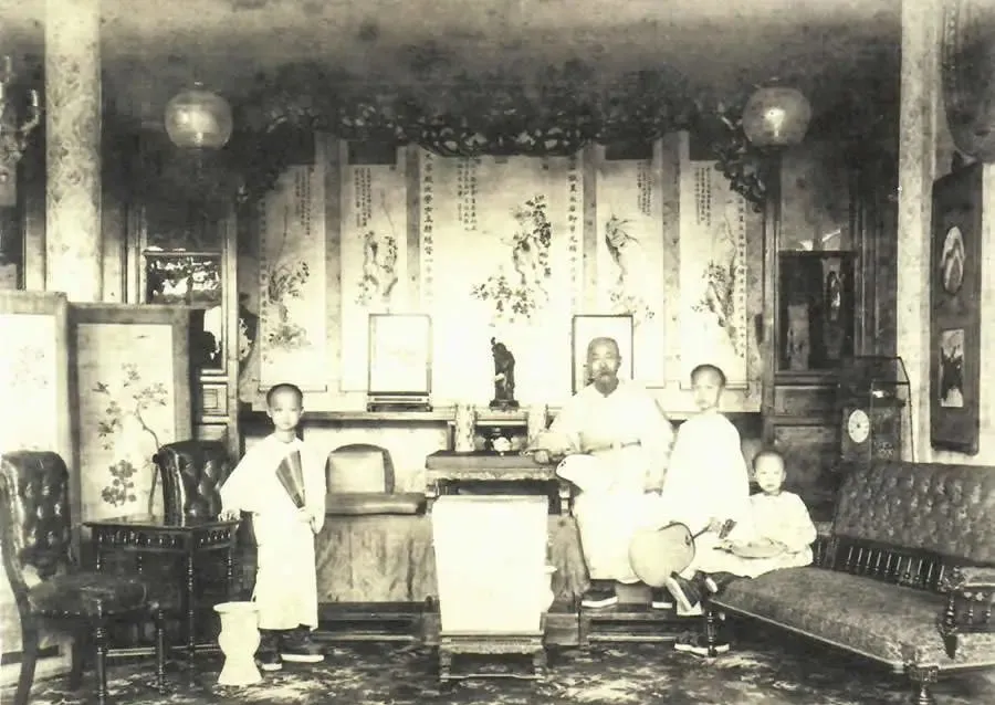 这张是在客厅里拍的,正中挂满字画与花鸟屏,梁上还盘着缠枝装饰,座钟立在角落,沙发是软包的,扶手亮着油光,几案上摆小像与书册,灯罩圆滚滚地悬着,孩子们站坐不一,手里也拿着团扇学大人样,屋里亮,可见窗外应是个晴天,家里陈设中西并置,那会儿天津新物件见得多,老规矩也不丢,氛围说不上豪奢,就是板正里透着细致。