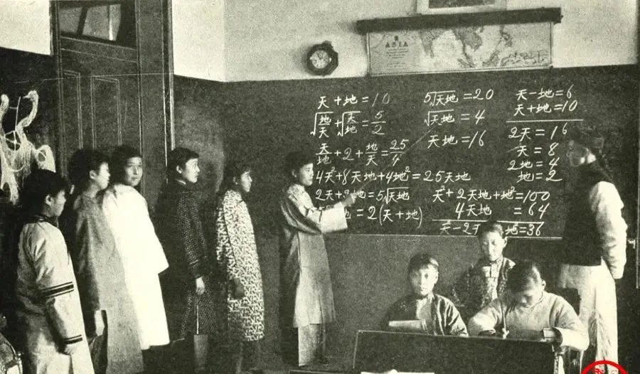 图里这块黑板上写着“天”“地”,其实就是未知数x和y,学校名是Chinkiang Girl’s School,镇江女子学校,老师举着粉笔讲得带劲,女学生们排着队上去演算,袖口宽宽,鞋底厚厚,屋里墙上还挂着世界地图,妈妈看着照片笑,说那会儿她们学校也流行黑板演算,谁算对了能得一枝红铅笔,可惜现在孩子上课都在屏幕上点来点去,黑板粉尘的气味没了,倒也省得手上白茫茫一层粉。