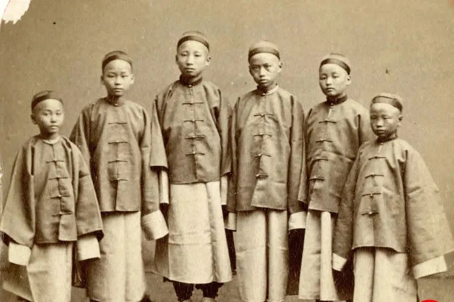 图中这一大群孩子叫留美幼童首批队,黑缎马褂齐刷刷,帽沿压得低低的,站在门口一字排开,牌匾上写着衙门名讳,神情还带点拘谨,出发前他们被嘱咐十五年学满再回,学费从关税里出,家里还按了手印立了契约,这阵仗如今想想也挺冒险的。