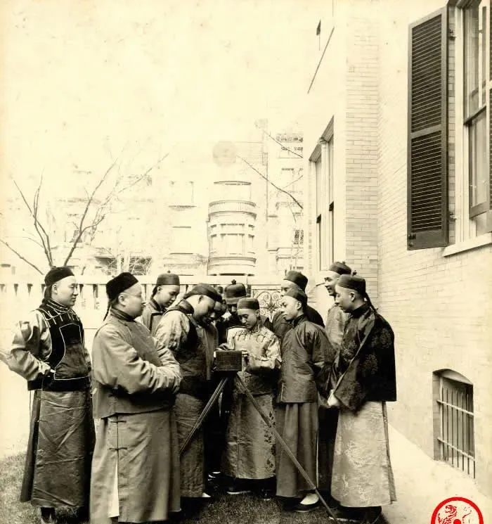 这个木匣子叫照相机,三脚架撑得稳稳的,前头鼓着小皮囊,旁边的人探着身子瞧,正讲怎么对焦怎么换底板,中间那位手指轻轻一拨,咔嗒一响,时间就被按住了,后来不少孩子回国后进了铁路、矿务、电报局,这会儿的好奇心其实早把路照亮了。