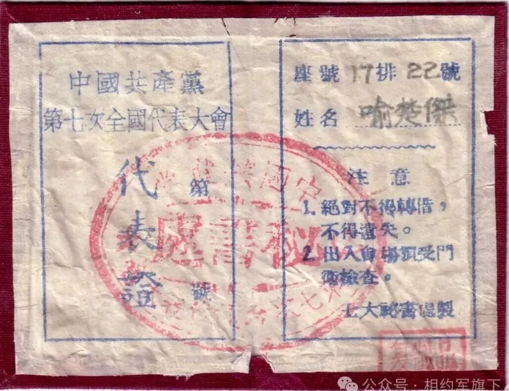 喻楚杰参加七大的代表证,座位在17排22号
