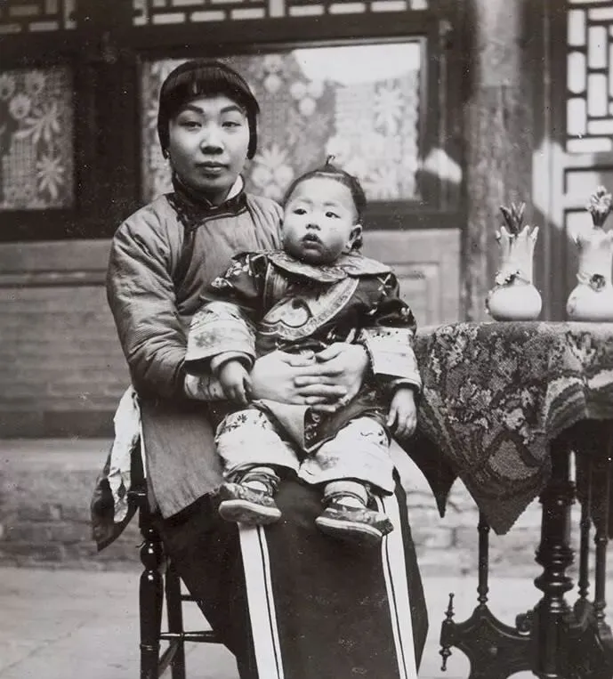 这个年轻娘子怀里抱着胖墩儿,前额的短刘海利落,绸面的孩童衣裳绣着纹样,袖口滚边,坐在雕花桌旁边,稳稳当当的,妈妈看了直夸,人家有派头,以前拍一张相片要挑日子,现在手机举起来咔嚓一串,味道不一样了。