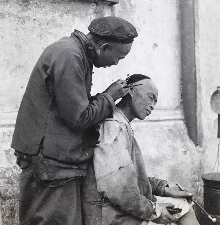 图中这摊叫剃头挑子,竹杆一放,小凳一摆,铜壶里温着水,剃头匠手里一把刮刀一把梳,脑袋一低,一溜顺光就出来了,辫子时代的规矩多,可没几年风一变,师傅们也得学新式剪刀了,我外公打趣说,刀法再好,也架不住时兴换了样。