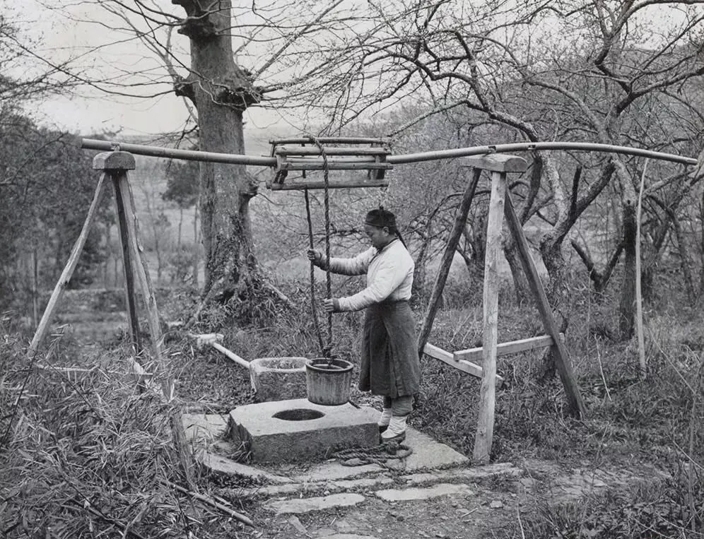 这套装置叫辘轳井,粗木架子成个门字,横梁上绕着绳,木桶一沉一提,井口石板被水迹打出暗光,女人手上青筋绽起,脚下裹腿缠得紧,以前喝水靠天靠力气,现在拧龙头哗啦啦,水来得太快,反倒不细想它从哪来。