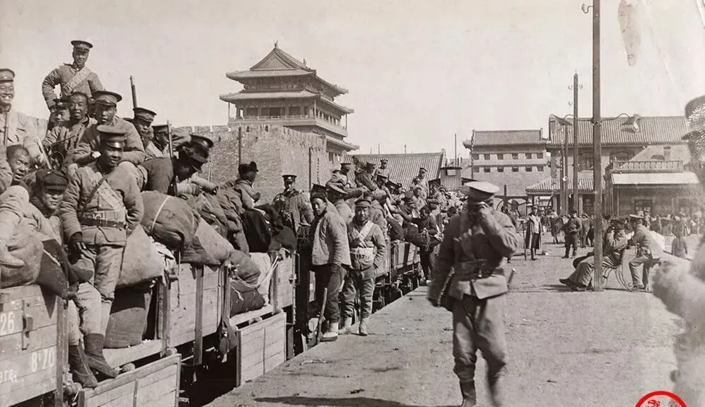 这站台上的队伍是新式军装,棉帽扣耳,背包成排,车厢木板刷着号子,城楼就在远处,兵们有的抽烟有的笑,铁轨把旧与新接到了一起,火车一响,辫子岁月也快到头了。