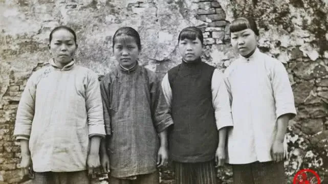 这四个姑娘站在斑驳的砖墙前,马面裙、对襟褂、短刘海,各自有各自的板正,眼神都是直的,不绕弯,也不装相,照片里没有花,偏偏她们就是花,开在风里不开口。